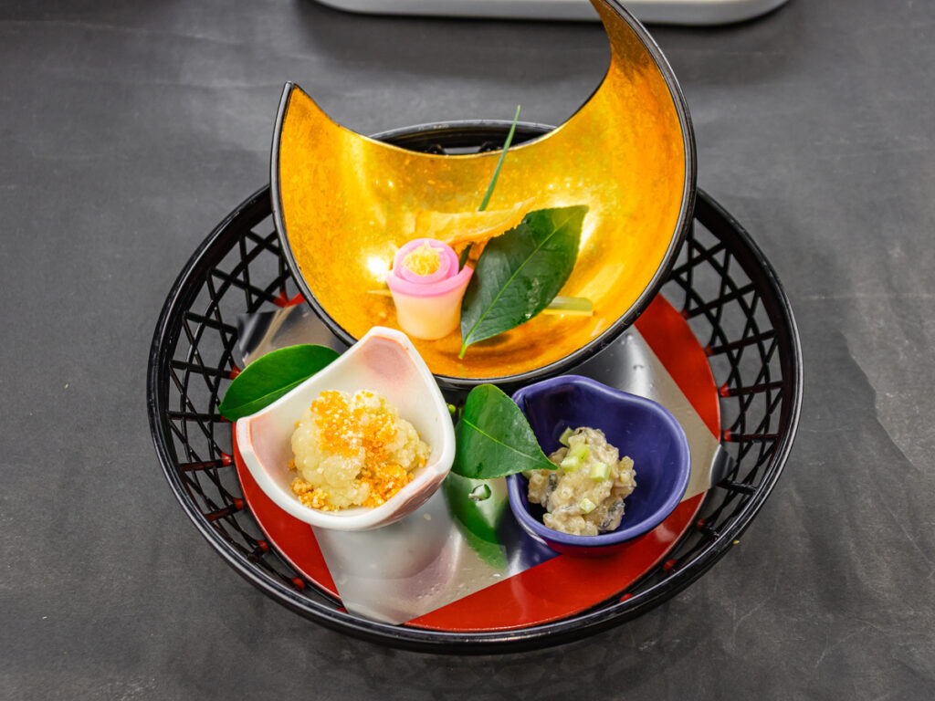 【前菜】「河豚-ふぐ-の粕和え」は河豚の身と皮を使用し、新酒が美味しくなる時期の吟醸酒粕を合わせ、香り立つ逸品です。「花甘藍-カリフラワー-唐墨チーズ」は、冬の霜で甘さを増すカリフラワーを唐墨の塩味で共す一品です。